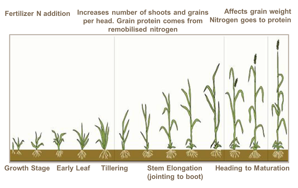 Ļoti svarīgs ir slāpekļa lietošanas laiks. Pirmais slāpekļa mēslojums (AS 25.-32.) galvenokārt tiek izmantots ražas veidošanai. Lai palielinātu graudu olbaltumvielu saturu, vairākkārtēja atkārtota slāpekļa mēslojuma lietošana nepieciešama starp 37. un 59. attīstības fāzi. Kad slāpekļa saturs lapās nav pietiekams, lai panāktu tā korekciju, graudaugu ziedēšanas laikā ( AS 70.) ir iespējams lietot ārpussakņu mēslošanas līdzekļus, kas satur slāpekli un sēru.