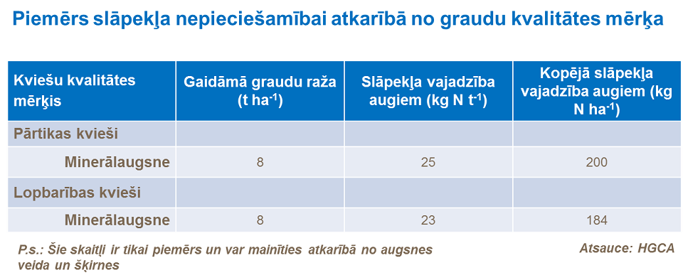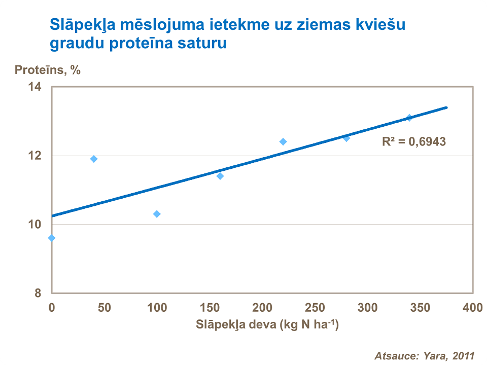 Lai sasniegtu augstāku proteīna saturu graudos, ir nepieciešams vairāk slāpekļa – tādējādi tiks apmierināts lielāks pieprasījums pēc tā. Savukārt kopējā slāpekļa nepieciešamība ir atkarīga no vēlamās ražas lieluma, kā arī proteīna satura. Graudu proteīna saturs lopbarības kviešiem pie optimāla slāpekļa mēslojuma ir aptuveni 11 % (kas atbilst 1.9 % N). Pārtikas kviešiem pie optimālas ražas proteīna saturs ir ap 12 %, un bieži ir nepieciešams papildu slāpeklis, lai apmierinātu tirgus prasības - proteīna saturu vairāk par 13 %. Zems graudu proteīna saturs, piemēram, mazāk par 10 %, lopbarības kviešu šķirnēm norāda uz nepietiekamu slāpekļa mēslojumu.