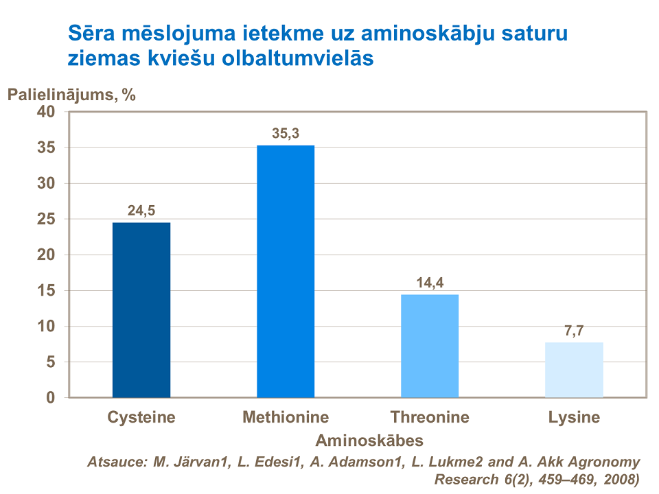 Sērs ir galvenā olbaltumvielu sastāvdaļa, tāpēc tas ir svarīgs proteīna daudzumam un kvalitātei. Tas ir atrodams dažās no galvenajām aminoskābēm (piemēram, cisteīns, metionīns, treonīns un lizīns), kas nodrošina iespēju no kviešu miltiem ražot mīklu. Skatīt izmēģinājumus ar YaraBela Sulfan, kas palielina ražu un proteīna saturu ziemas kviešiem.