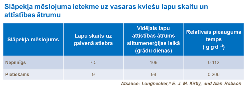 Tur, kur dzinumu skaits ir zem optimālā, lietojot augstākas slāpekļa mēslojuma devas agri sezonas sākumā (AS 25-30), palielināsies dzinumu skaits un līdz ar to arī vārpu skaits.