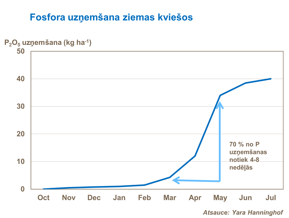 Ir svarīgi nodrošināt augiem viegli pieejamu fosforu, lai novērstu tā ierobežojošo ietekmi uz dzinumu augšanu. Ziemas kviešiem svarīgi ir ievērot divus laikus. Pirmais - agrā augu attīstības stadijā (AS 13.-25.), kad notiek strauja lapu un sakņu augšana un attīstība, bet otrais - kad atsākas augšana - pavasarī (AS 25.-30.). Laika posmā no aprīļa līdz maijam tiek uzņemti 70 % fosfora, tāpēc fosfora mēslojuma lietošana rekomendējama arī pavasarī, lai apmierinātu šo vajadzību.